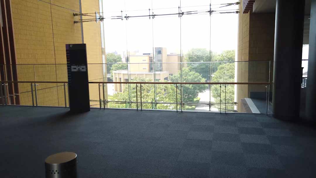 大きな窓と開放的な空間が特徴のラウンジです。窓からはチャペルとその前の芝生が見えています。学生が自由に使うことのできるラウンジスペースなので、私はここで友達とランチを食べたり、授業の課題をしたりしています。