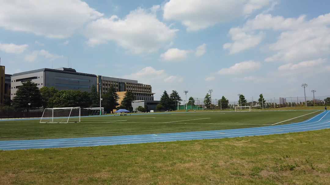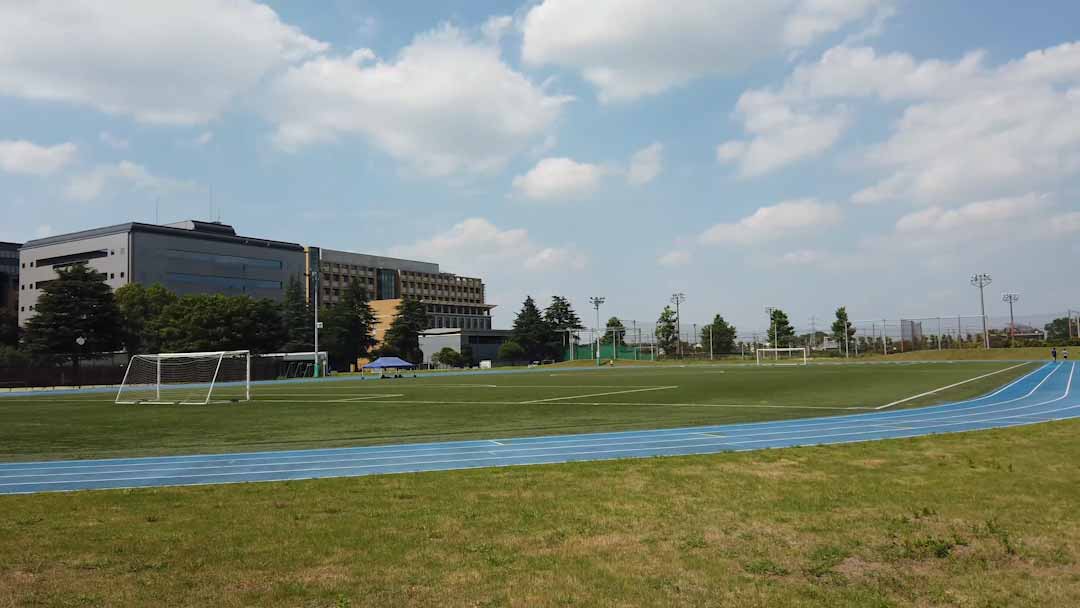体育の授業のほか、陸上競技部の練習などで使用されます。ここには陸上競技場、多目的エリア、アーチェリー場、テニスコート、フットサルコートがあり、夜間照明が完備されている充実した施設となっています。陸上競技場には400mトラックや100m直走路に加えて、トラック周りに山なりの道が特徴的なクロスカントリーコースが設けられています。小さい山なりに見えるかもしれませんが、実際に走るととても大変です。(理工学部・村上さん)